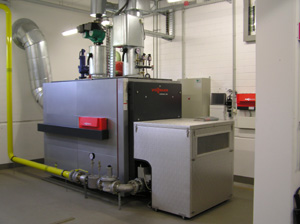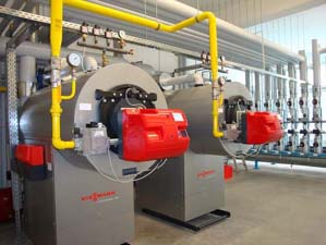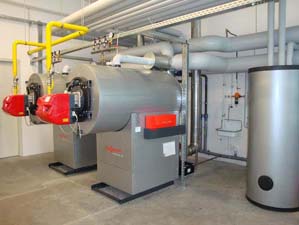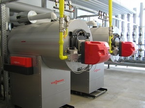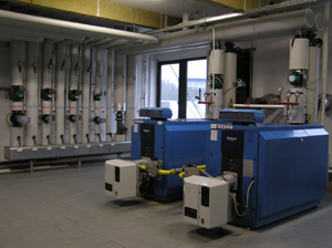 Gas-Kaskadenanlage mit 800KW Leistung. Die Heizungsanlage wird über die Gebäudeleittechnik (LON-BUS) gesteuert.