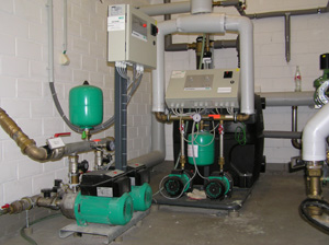 Gas-Brennwertkaskadenanlage mit Kessel 816KW Leistung. Norm-Wirkungsgrad: 109%
