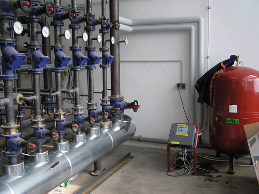 Das Ausdehnungsgefäß rechts im Bild fasst ein Volumen von 500 Litern Wasser, um den Anlagendruck konstant zu halten. Bei Bedarf füllt es auch selbstständig enthärtetes Wasser nach.
