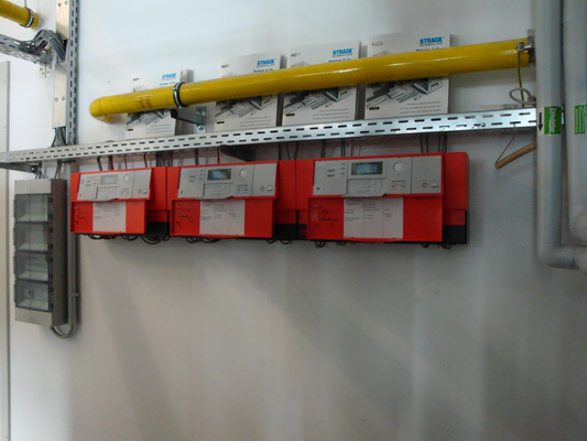 Alle Steuerungen sind über den LON-Bus miteinander verbunden und errechnen somit die Solltemperaturen für jeden einzelnen Heizkreis sowie die Kessel. Die rechte im Bild ist die Kaskadensteuerung. Bei ihr treffen alle Werte und Anforderungen zusammen. Sie entscheidet letztendlich auf welcher Leistungsstufe die Brenner jeden einzeln Kessel befeuern. Darüber hinaus versorgt sie die anderen Steuerungen mit Informationen,