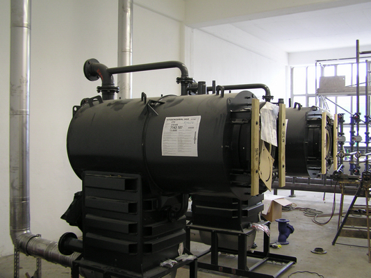 Hier wird gerade die Abgasanlage montiert. Die Abgastemperatur liegt 5 bis 15 Kelvin über der Rücklauftemperatur (Heizwassereinlauftemperatur).