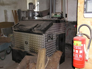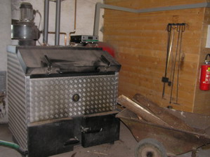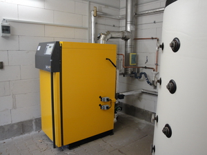50KW Scheitholzkessel der Firma Lopper. Hinter der rechten Holzverkleidung befindet sich ein 5700 Liter Pufferspeicher. Der Puffer speichert die abgegebene Energie bzw