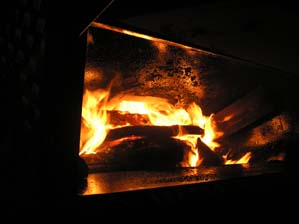Brennkammer während Betrieb, hier findet die "Holzvergasung" statt.