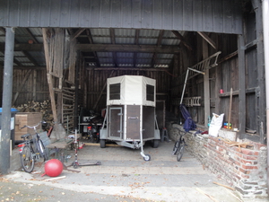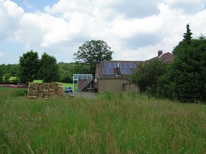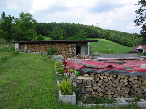 In diesem Bild befindet sich links der Brennstoff für die kalten Tage und rechts auf dem Dach die Sonnenkollektoren für die Heizungsunterstützung. Die Kollektoren unterstützen im Winter die Heizung sowie die Warmwasserbereitung