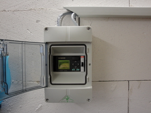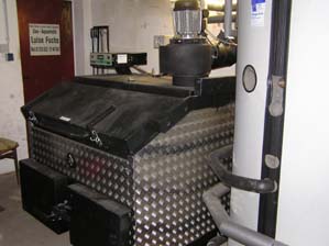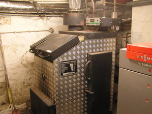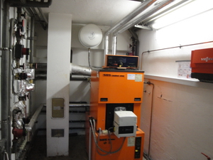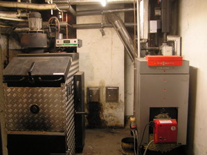 "Alter" Heizraum ausgestattet mit neuer Regelungstechnik, witterungsgeführte Regelung rechts im Bild.