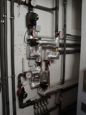 "Alter" Heizkreisverteiler ergänzt um 3-Wegestellventile für alle Heizkreise. Die Pumpen wurden bei dieser Gelegenheit durch Hocheffizienzpumpen ersetzt. Die dort vorher sichtbare Schalterkombination zum Abschalten der Pumpen ist nicht mehr nötig, da diese Aufgabe die neue witterungsgeführte Regelung übernimmt.