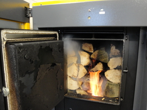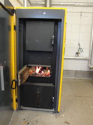 45KW Scheitholz Kessel, der Füllschacht ist 1,18 Meter breit.