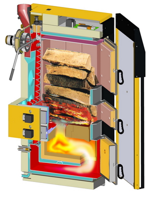 Lopper Holzvergaserkessel im Schnitt. Der vordere Schacht bevorratet den Brennstoff, die hintere Kammer dient zur Vergasung mit ca. 1100 Grad Celsius.